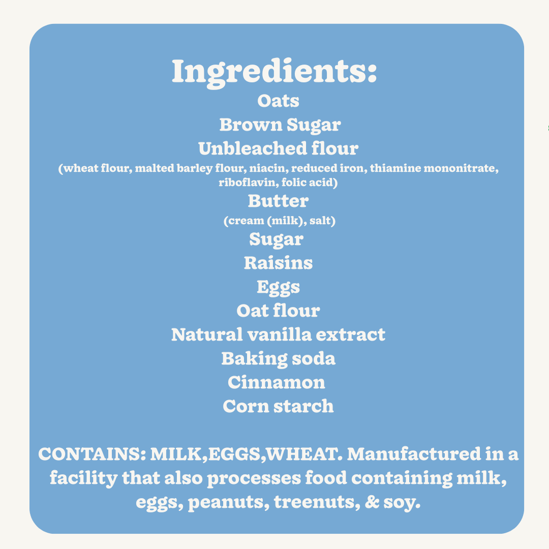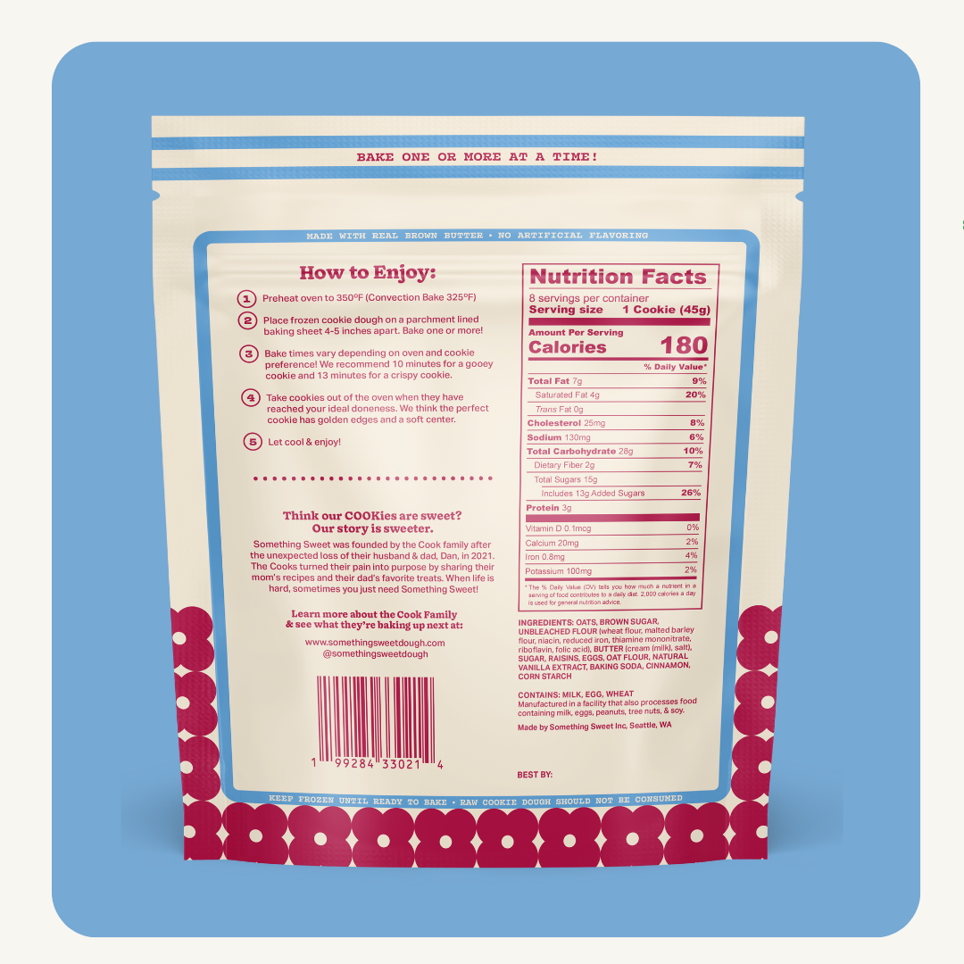 Our brown butter oatmeal raisin is crafted with real brown butter. Individual dough pucks with a wholesome twist on a timeless cookie, combining hearty oats, juicy raisins, and brown butter richness.